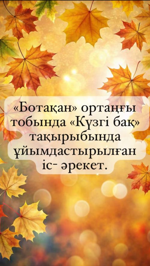 «Ботақан» ортаңғы тобында «Күзгі бақ» тақырыбында ұйымдастырылған оқу іс-әрекеті өткізілді. Іс-шараның мақсаты – балалардың күз мезгілі және күзгі бақтағы өзгерістер туралы түсініктерін кеңейту, жеміс-жидектер мен көкөністерді ажырата білуге, табиғатқа деген сүйіспеншіліктерін арттыру болды. Балалар күзгі бақтың сұлулығын тамашалап, әртүрлі жемістер мен көкөністерді танып білді.