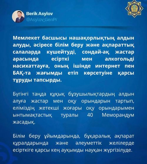 Бүгінгі таңда құқық бұзушылықтардың алдын алуға жастар мен оқу орындарын тартып, еліміздің жетекші жоғары оқу орындарымен ынтымақтастық туралы 40 Меморандум жасадық.
